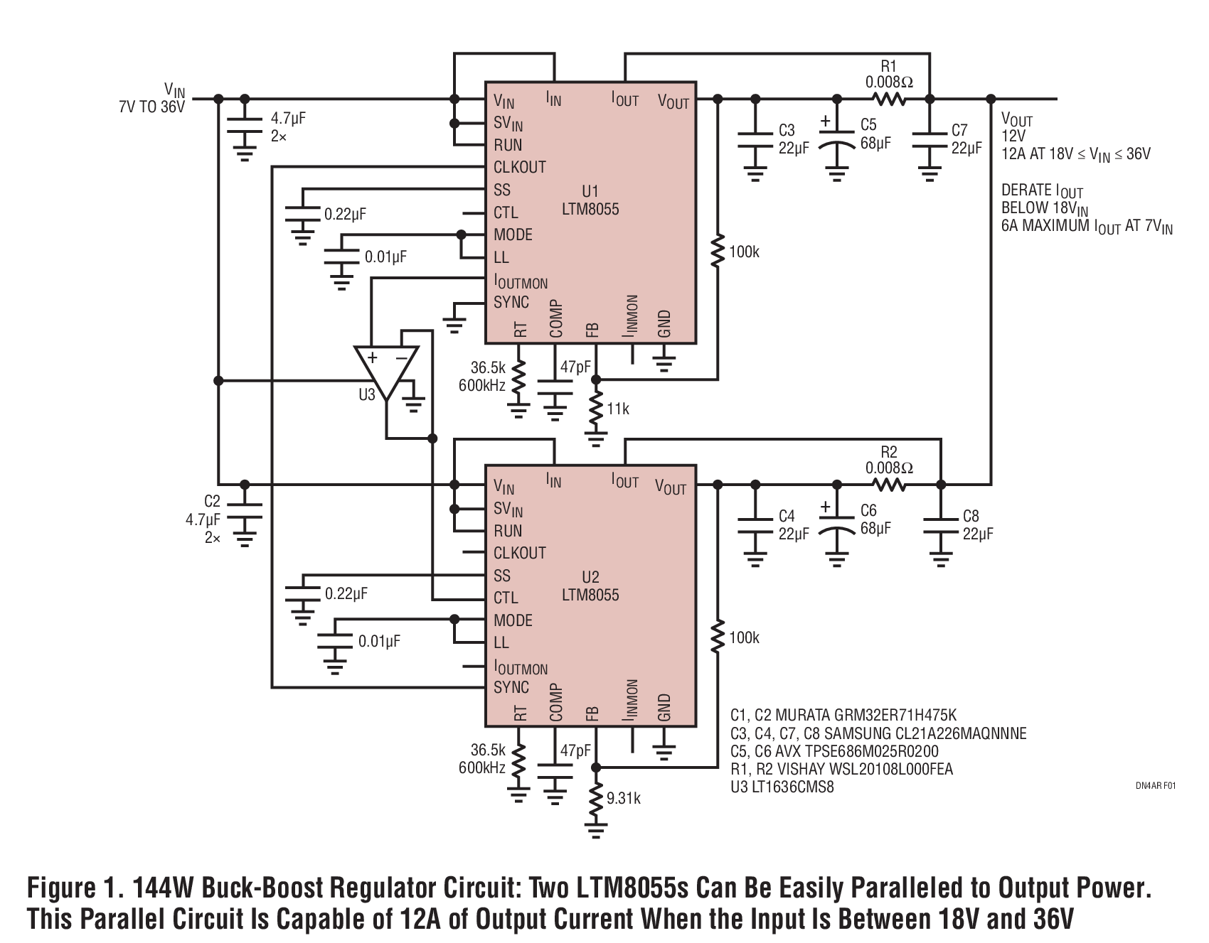 Figure 1. 144W Buck-Boost Regulator Circuit: Two LTM8055s Can Be Easily ParalleLEDto Output Power. This Parallel Circuit Is Capable of 12A of Output Current When the Input Is Between 18V and 36V