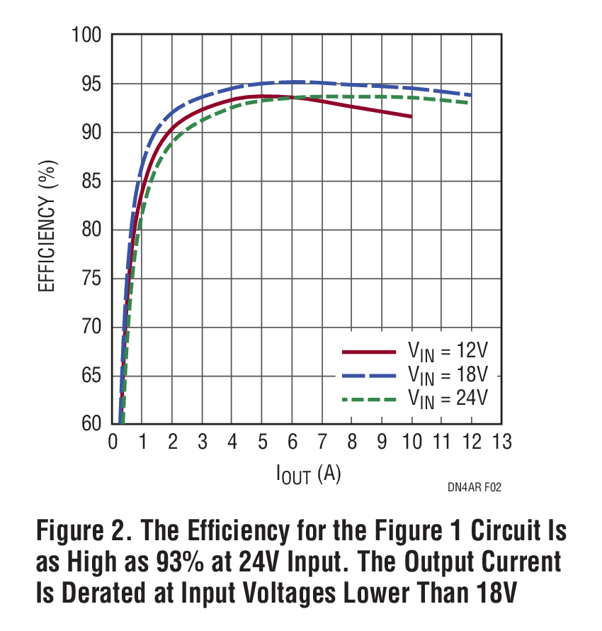 可容易地并联多个 LTM8055 以提升输出功率能力。图 1 示出了一款 12V 输出稳压器,其由两个并联的 LTM8055 (一个 CV 主控稳压器 U1 和一个 CC 从属稳压器 U2) 组成,能够在输入介于 18V 和 36V 之间时提供 12A 的输出电流。如图 2 所示,图 1 中的电路在采用 24V 输入时的效率高达 93%。当输入电压低于 18V 时,输出电流会降额。