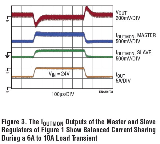 主控稳压器的 CV 操作和从属稳压器的 CC 操作确保了平衡的均流。IOUTMON 负责监视输出电流,而 CTL 引脚则设置电流源稳压器的输出电流。主控稳压器被设置为期望的输出电压,而从属稳压器则被设置在一个较高的输出电压,因为 LTM8055 一般调节的是电流而非电压。主控稳压器调节输出电压,而且其 IOUTMON 引脚连接至从属稳压器的 CTL 引脚,这强制 LTM8055 均等地分享负载电流。一个单位增益缓冲器允许主控稳压器的 IOUTMON 引脚驱动从属稳压器的 CTL 引脚。图 3 示出了图 1 中两个并联稳压器的负载均分,其中 IOUTMON 输出在 6A 至 10A 的负载瞬变测试期间保持相等。