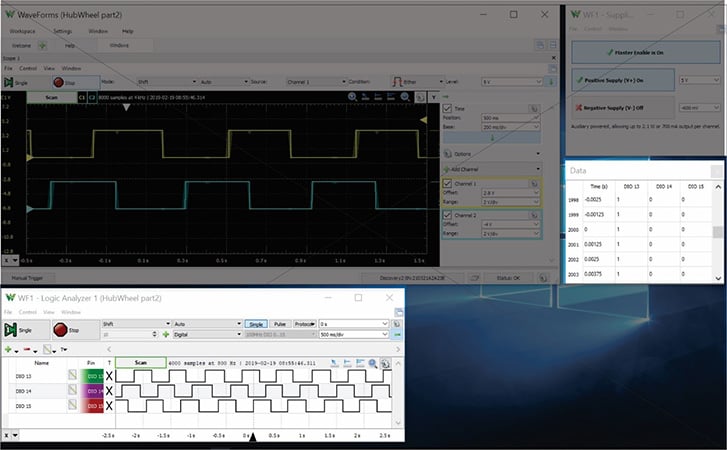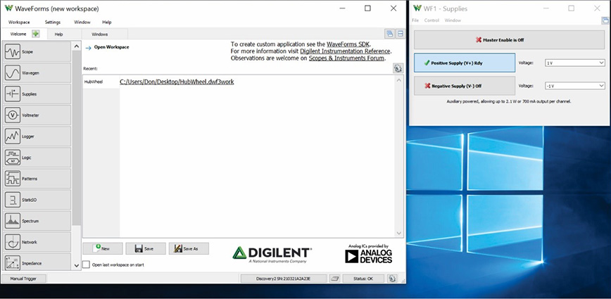 Diligent Analog Discovery 2 或许不具备高端、独立的实验室设备的所有功能,但可用于将很多电子器件和传感器产生的信号可视化。若没有这种直观显示工具,试验者就只能想像电路中的传感和控制信号发生了什么,以及电路如何对这些信号作出响应。