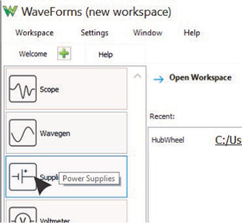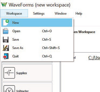 WaveForms 是实现 AD2 需要用到的可下载软件。完成下载和安装后,选择 Workspace(工作空间)下拉菜单,然后从列表中选择 New(新建)。一个新的工作空间将会打开,且随时可在这里进行配置(图 3)。