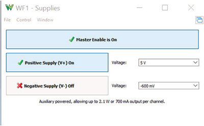 通过从 Positive Supply (V+)(正电源 (V+))对应的 Voltage(电压)下拉选择器中选择 5 V 对电源进行配置。通过切换按钮,确保 Negative Supply (V-)(负电源 (V-))处于 Off(关闭)状态。该按钮应该显示文字“Off”(关闭),且显示红色叉号“X”。通过将 Master Enable(主启用)切换为“On”(开启),启用输出(图 6)。