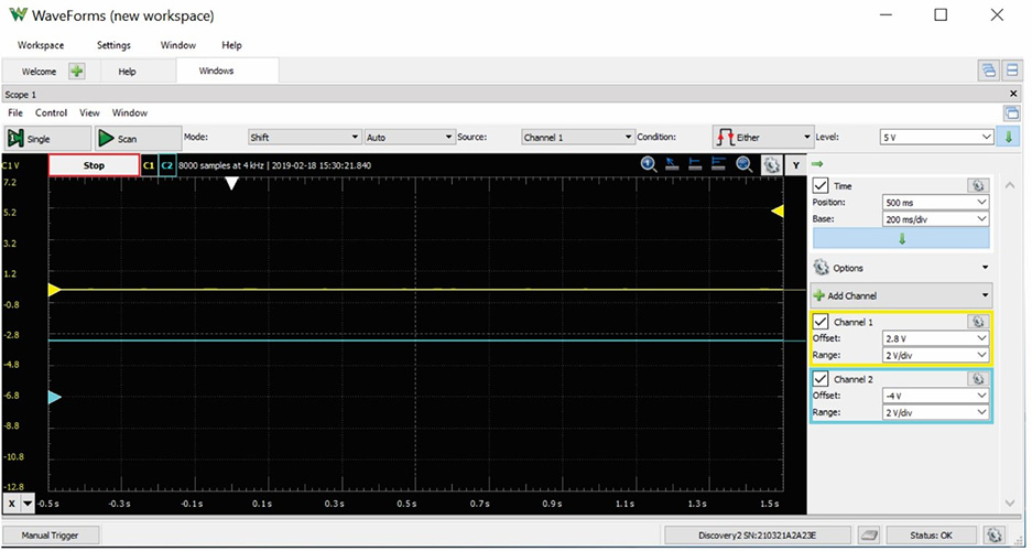 示波器:使用示波器工具,用户可以直观查看和测量传感器输出波形。在 Waveforms 欢迎页面上,选择 Scope(示波器)选项卡(图 7)。选择停靠/取消停靠图标,使示波器对话框处于浮动状态。然后调整对话框大小,尽可能占据最小的显示空间。