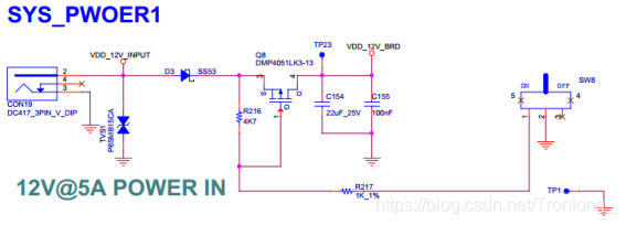 开发板采用12V@5A直流电源供电,CON19为电源接口,SW8为电源拨码开关,硬件及引脚定义如下图: