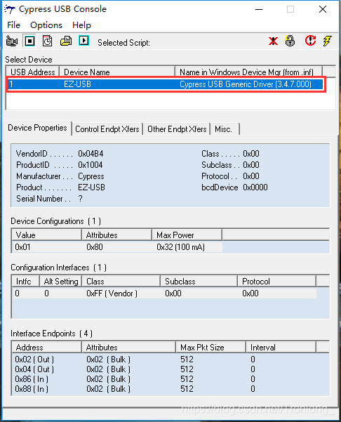 (2) 设备驱动连接:根据软件安装文档《Cypress USB驱动安装》安装USB驱动,接着打开CyConsle.exe(路径:"C:\Cypress\Cypress Suite USB 3.4.7\CyConsole"),即可显示USB驱动,界面如下图所示: