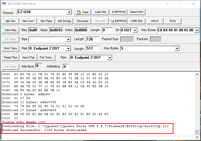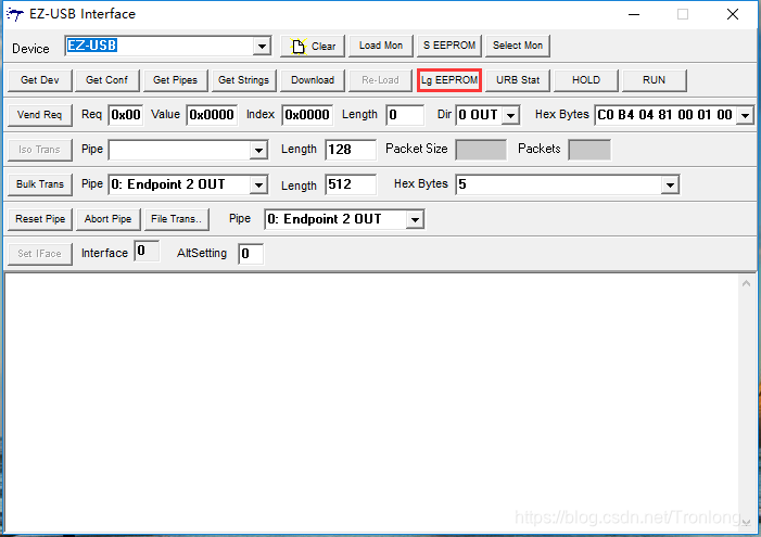 选择"Options->EZ-USB Interface",在"EZ-USB Interface"界面里选择"Lg EEPROM"按钮,选择生成的bulkloop.iic文件打开(路径为"Demo\USB"),这时可以看到PC已经检测到开发板的USB设备。如下图所示: