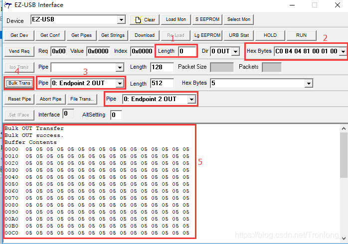 - 操作执行测试:开发板加载usb_test.bit文件(路径为"\Demo\USB\ForDownload"),Length和"Hex Bytes"如下图红框配置,Pipe选择IN或OUT。最后点击"Bulk Trans"按钮进行发送或接收512Byte数据,如下图所示: