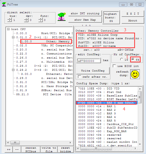 (1) 运行PciTree,可以看到开发板相关信息,如下图所示: