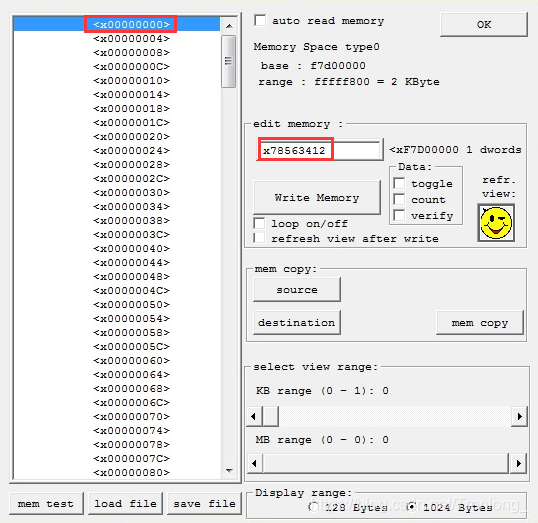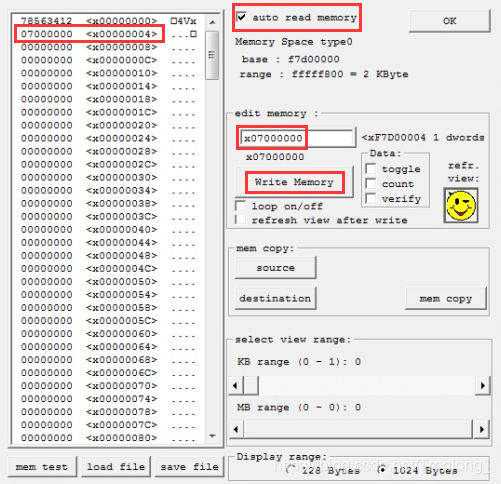 可对任意单个寄存器进行读写操作,选中对应的地址,在''edit memory''输入值,点击''Write Memory'',勾选''auto read memory'',即可看到从板卡中读出的数据。