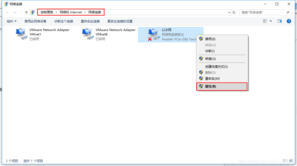 - 打开“控制面板->网络和Internet->网络连接”,可看到当前以太网,右键选择属性: