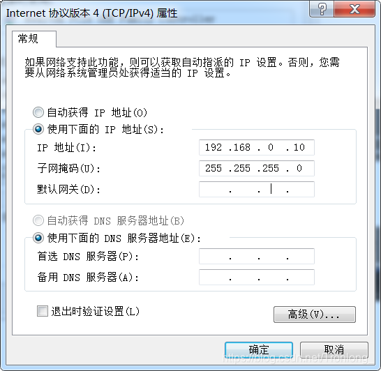 点击“使用下面的IP地址”,手动设置IP,与开发板IP为同一网段:192.168.0.10,然后点击“确定”,如下图所示: