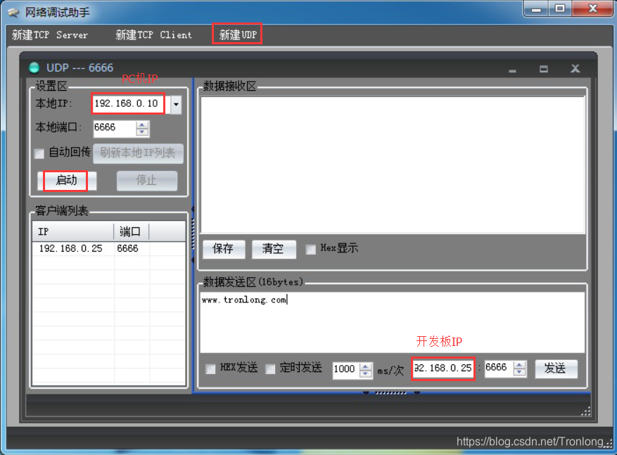 - 打开网络调试助手软件(路径:"光盘资料/Tools/NetDebugTool/NetDebugTool.exe"),新建UDP,输入主机IP跟端口号,输入开发板IP跟端口号,按启动。