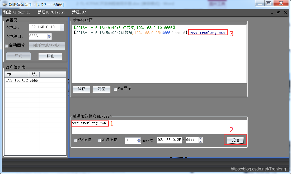 在发送区输入需要发送的数据,FPGA开发板回送接收到的数据并显示,左边会显示客户端列表,如图所示: