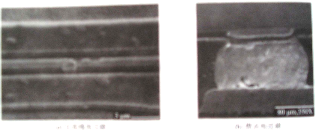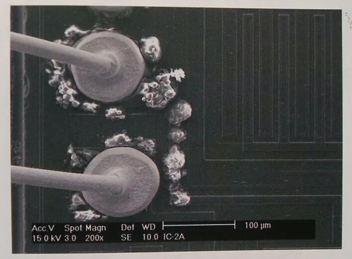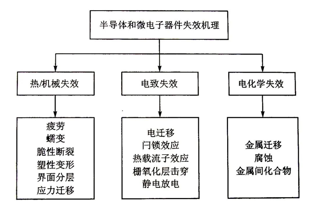 栅极电压Vg小于漏极电压Vd时,栅极绝缘膜下的沟道被夹断,漏极附近电场增高;源极流经此区的电子成为热电子,碰撞增多---漏极雪崩热载流子;注入栅极二氧化硅膜中,使其产生陷阱和界面能级,阈值电压增加,氧化层电荷增加或波动不稳,器件性能退化(6)与时间相关的介质击穿(Time Dependent Dielectric Breakdron)击穿模型:I/E(空穴击穿),E(热化学击穿)I/E模型:电子穿越氧化膜®产生电子陷阱和空穴陷阱+电子空穴对®空穴隧穿回氧化层,形成电流®空穴易被陷阱俘获®在氧化层中产生电场®缺陷处局部电流不断增加,形成正反馈®陷阱互相重叠并连成一个导电通道时,氧化层被击穿。E模型:热动力学过程,处于热应力和外加电场下的偶极子相互作用破坏了Si-O键而产生击穿。3、电化学失效• 金属迁移----从键合焊盘处开始的金属枝晶生长,是一金属离子从阳极区向阴极区迁移的电解过程。现象:桥连区的泄漏电流增加,甚至短路迁移离子:Ag,Pb,Sn,Au,Cu预防银迁移的方法:使用银合金;在布线布局设计时,避免细间距相邻导体间的电流电位差过高;设置表面保护层;清洗助焊剂残留物• 腐蚀出现条件:封装内存在潮气和离子沾污物本质:电化学反应