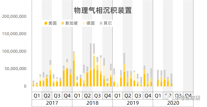 与热处理扩散设备和CVD设备不同,我国进口的PVD设备的高峰在2018年。2019和2020进口数额反而有下降趋势,而且金额总数也相对偏低。同期进口只有21亿美金