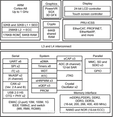 TI Sitara AM335x是一款高性能嵌入式32位工业级Cortex-A8处理器,主频可高达1GHz,运算能力可高达2000DMIPS,搭配DDR3,兼容eMMC和NAND FLASH,拥有多种工业接口资源。以下是AM335x CPU资源框图