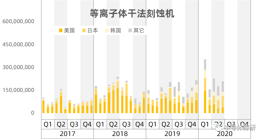 等离子刻蚀设备的进口量总体变化不大。仔细确认,可以看出在2018年起,开始有所增加,但之后基本持平