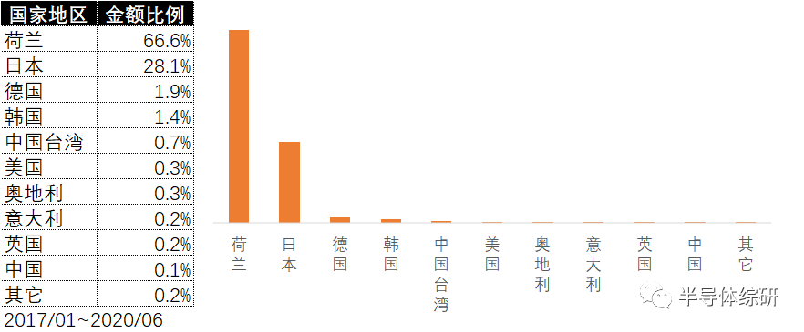 而从进口来源国家地区来看,我们的进口高端光刻机基本都是来自于荷兰和日本,其中荷兰一国占据86.2%