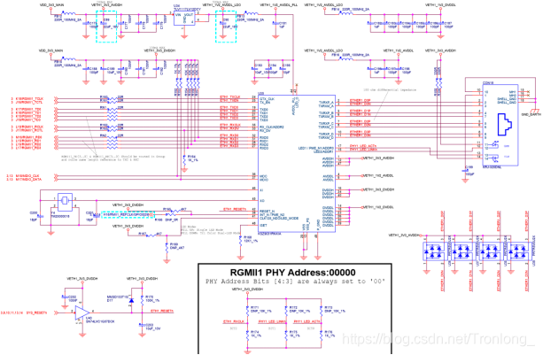 除此之外开发板配置了两个RGMII千兆以太网口CON18和CON19,采用了KSZ9031RNXIA网络芯片,自适应10/100/1000M网络,RJ45连接头内部已经包含了耦合线圈,因此不必另接网络变压器,使用普通的直连网线即可连接开发板至路由器或者交换机。其硬件位置及原理图如下图所示: