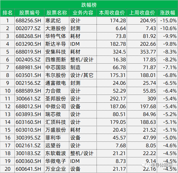 而下跌的股票里,只有2支周跌幅超过10%,第20名的跌幅约4.5%