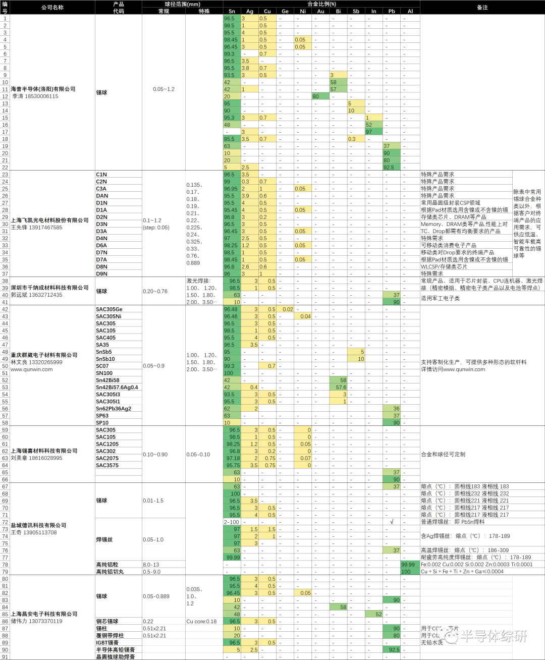 不过事实上,锡球的种类很多,各家产品成分、大小、用途以及一些相关技术指标都不一样。所以我尽自己能力,联系到好几家的供应商,并拿到了他们封装锡球(含其它材质)的详细产品数据,做成统一的表格,供大家参考: