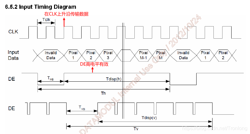 评估板支持的12.1英寸LVDS显示屏型号为友达的G121SN014 V4。查看12.1英寸LVDS显示屏数据手册,关键参数如下。手册中未说明Front-porch、Back-porch、Sync-len等典型值,仅给出总的行/帧同步时间Blanking,可将总同步时间合理划分为对应的Front-porch、Back-porch、Sync-len时间。手册并未说明Hsync、Vsync的极性,默认低电平有效。