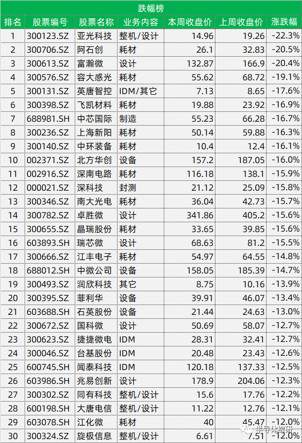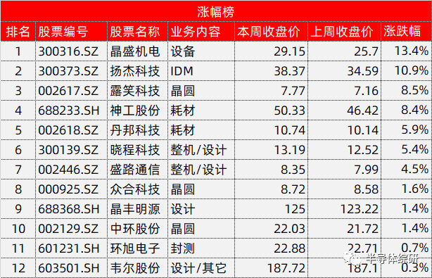 以下是本周股票价格相关的具体数据: 详细数据请参考下表 注:文章源于半导体综研