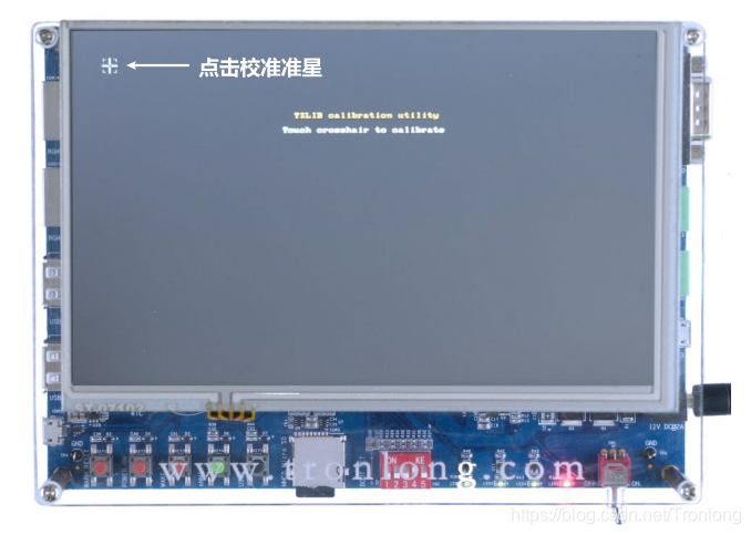 执行命令后LCD会弹出校准界面,如下图所示,请依次点击校准准星。连续点击五次之后,会在文件系统”/etc/”下生成触摸屏校准文件pointercal,校准后的信息记录在pointercal文件中。