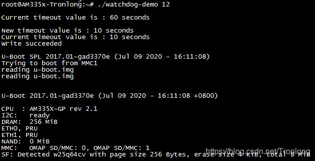 watchdog-demo是一个内部看门狗测试程序,程序将读取系统预设看门狗等待时间,并重新设置看门狗等待时间为10秒,同时让系统在指定的时间内不喂狗。如果设置的指定时间超过预设看门狗等待时间,系统将会重新启动。