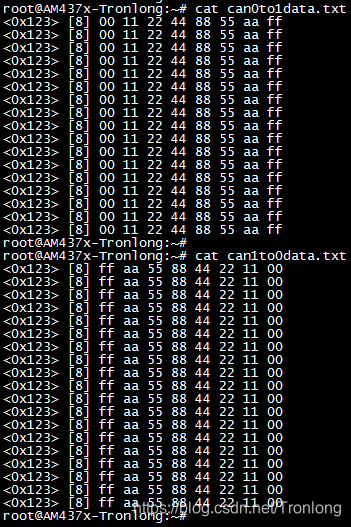 打开当前目录下生成的can0to1data.txt和can1to0data.txt文件,查看文件内容数是否和下图一致。如一致则表示CAN通信功能正常。