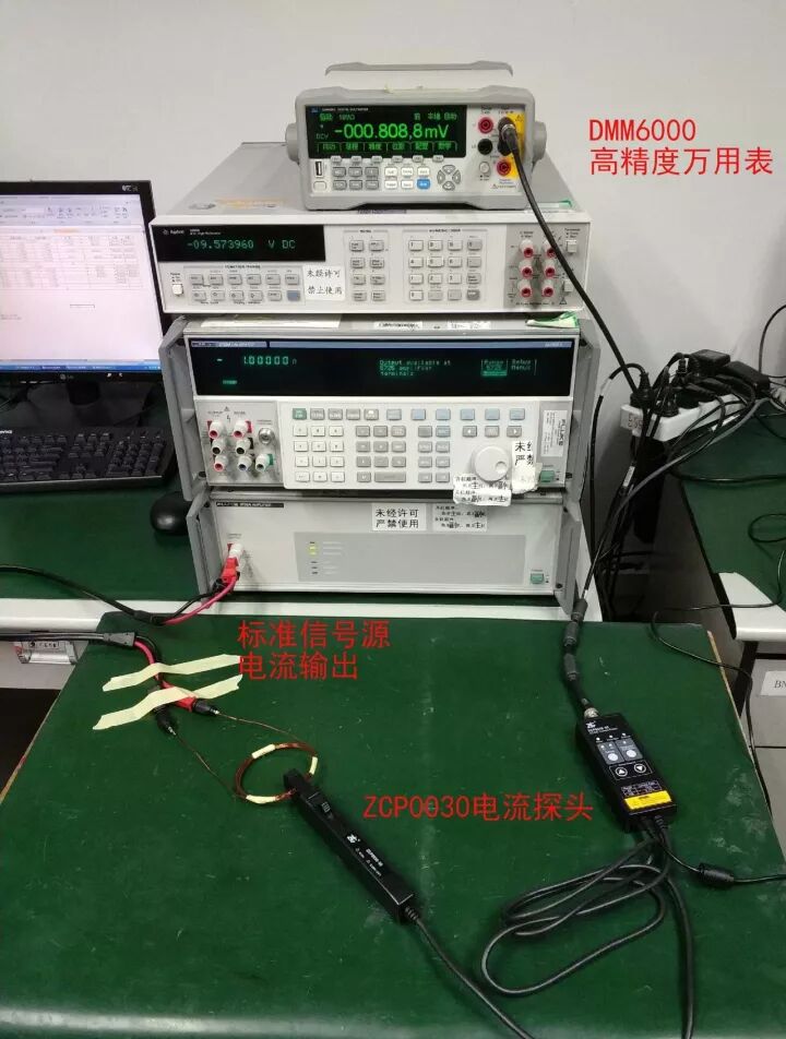精度测试所使用试仪器为FLUKE5720校准器、六位半万用表DMM6000。测试步骤,校准器FLUKE5720输出不同的被测电流值,万用表读取电流探头的响应电压值。