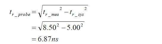 如图2所示,根据示波器测量到的上升时间为8.5ns,这个总时间是信号发生器自身的上升时间加上探头的上升时间,所以实际上探头的上升时间还需要将总时间减去信号发生器自身的上升时间,具体的计算公式如下。