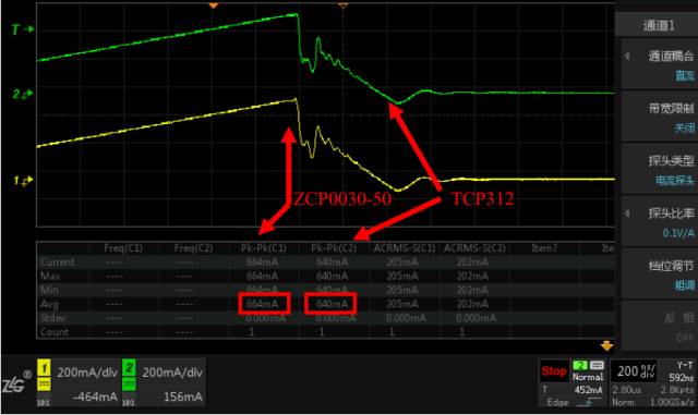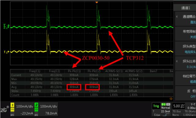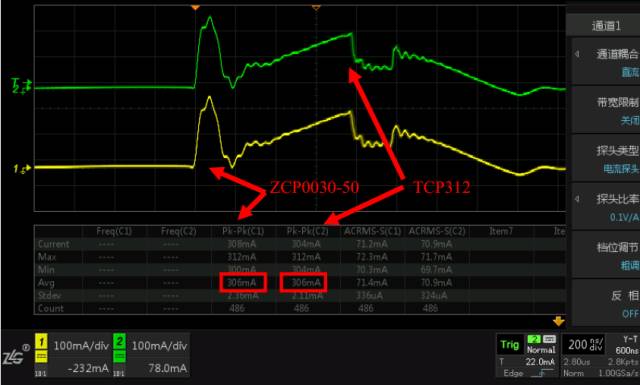 示波器电流探头主要用来配合示波器观察电路上的电流波形,比如说MOS管上的电流波形,方便工程师调试电路,发现电路问题。通过测量开关电源开关管上的电流波形,将ZCP0030-50和T公司的TCP312进行对比测试,进一步验证性能。