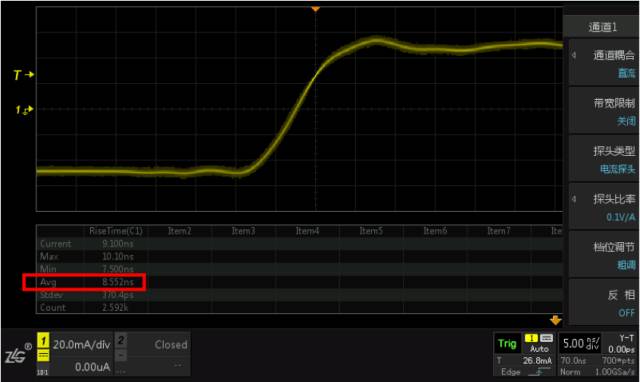 ZCP0030-50的带宽是50MHz,对应上升时间≤7ns。探头上升时间是指测试脉冲时,测量系统响应波形从稳态值的10%上升到90%所需要的时间,是一个很关键的参数,上升时间越快,说明探头的响应越快,能测到更加快速变化的电流波形,还原电流波形的性能越好。