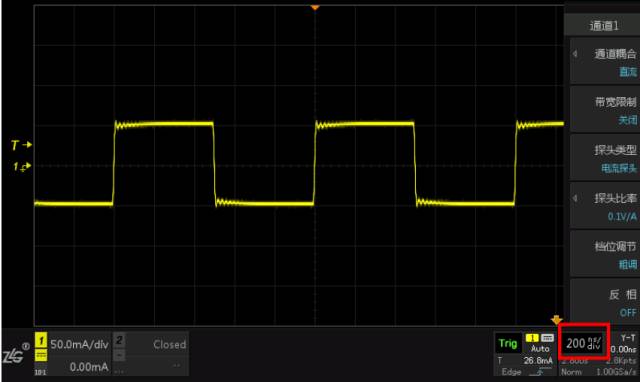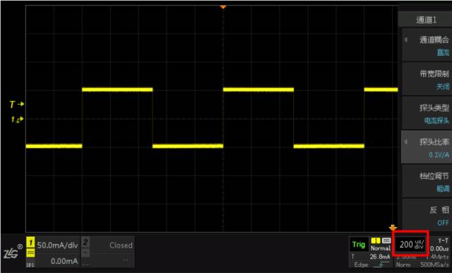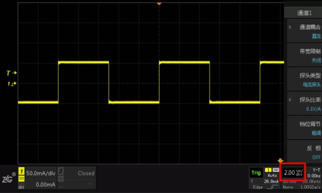 测试电流探头的方波响应时,使用的测试仪器是信号发生器Keysight33600和示波器ZDS2022。信号发生器产生电流峰峰值为100mA,频率分别1KHz、100KHz、1MHz为的方波,示波器显示相对应的方波波形。