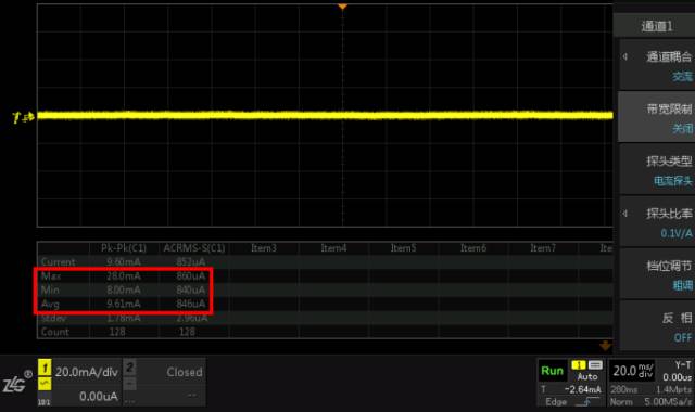 噪声测试主要是使用示波器ZDS2022来观察测试,并记录相应的测试值。