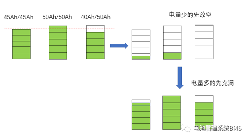 4. 电池的成组效率。上述的特性是以单个电芯表现出来的特性。在实际整包应用中,由于电芯的串并联组合,会使情况变得更加复杂。不同电芯间难免存在欧姆内阻、极化内阻、自放电率、初始容量等差别。如下图为一个最简单的例子:一个电池包由三个电芯串联而成,额定容量为50Ah,不考虑均衡。由于额定容量和初始容量存在差异,实际在放电过程中,电量少的先放空,充电时电量多先充满。这就造成了成组后的效率降低,也让成组后的SOC预估更加困难。