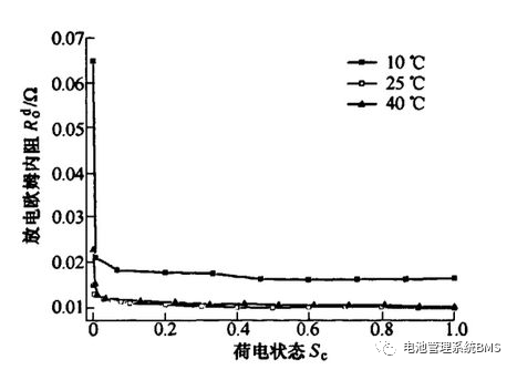 3. 温度特性。前面两期有提到不同材料体系的电池,表现出来的温度特性是不一样的。以磷酸铁锂为例,下图为不同温度下电池表现出的SOC与内阻关系。总体而言,电池的内阻随着温度和SOC的变化而变化,且对于低温很敏感。同理,OCV,极化等参数,也会随着温度的变化而变化。这无疑进一步加剧了预测的难度。