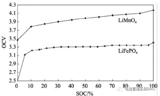 1. 电池开路电压(OCV)特性。电池开路电压指的是电池在静置状态下,正负电极之间的电位差。以下图为例,图中展示的是两种锂电池的OCV-SOC曲线。一般通过充电或者放电到特定SOC后,电池进行静置一段时间(通常为两个小时或者更长时间)测量得到的电池电压,以此得出OCV-SOC曲线(注:一般而言,即便对于同一SOC,充电后和放电后静置得到的OCV也是不一样的)。对于三元类电池,SOC与OCV对应关系还好,严格单调,且不同SOC的OCV差异比较明显。但是对于磷酸铁锂而言,有一段相当长的SOC区间很平坦,OCV差异很小,而且并非严格单调的,表现为同一个OCV值对应多个SOC点。所以单纯用SOC-OCV对应关系来预估SOC,存在静置时间难以满足,精准度不够等难题。