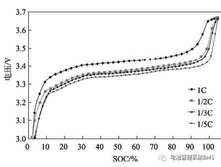 选取某个电流倍率,让电池以该倍率进行恒流充电或者放电(注:同一电流下充和放,得到的曲线也是有差异的),可以得到一组端电压与SOC的对应关系。下图为某一个温度下,磷酸铁锂电池不同倍率的端电压曲线。那能否以这一曲线进行SOC预估呢?实际上,除了电池恒流充电阶段,电池的工况电流很少有长时间恒流充放电阶段,只要有不同电流切换存在,那么电池极化的差异就会让端电压偏离预测曲线。