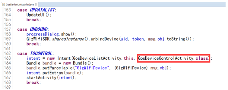 1)框架工程内提供的代码已经可以在不修改任何代码的前提下,进行到控制界面的跳转操作,开发者只需要关心操作界面的逻辑即可,如果需要在设备列表界面中点击某设备后,跳转到自己创建的控制器视图中,请在 GosDeviceListActivity.java 文件中修改相应跳转参数。请按照图示修改跳转视图的类定义,如果使用默认提供的空白界面(GosDeviceControlActivity)来进行编写控制界面,可略过此步骤。
