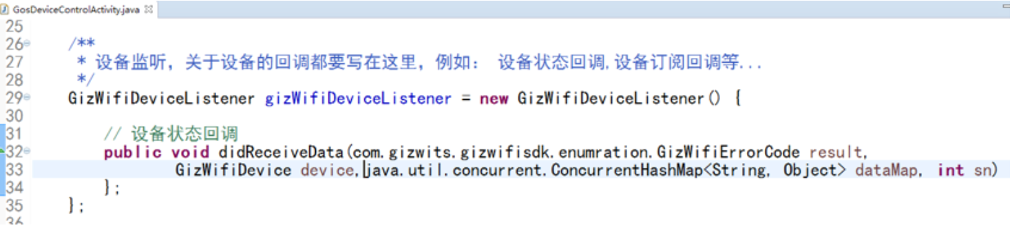 3)控制界面中对当前设备设置监听,例如:device.setListener(gizWifiDeviceListener);