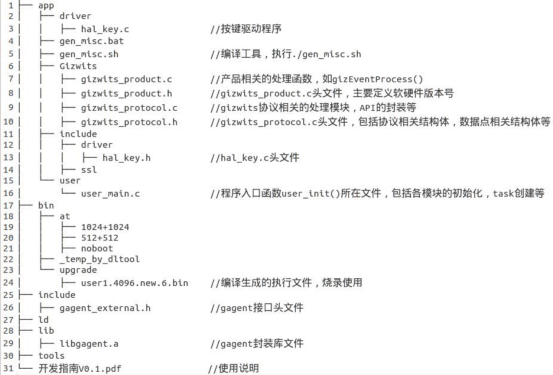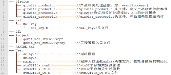| gizwits_product.c | 该文件为产品相关处理函数,如 gizEventProcess()平台相关硬件初始化,如串口、定时器等 |