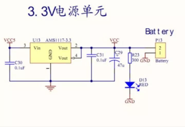 在右边又出现了一个VCC,我们可以判断出这个VCC所连接的导线上的电压是3.3V。C29是电解电容,它起到的是储能的作用。右下方的GND就是单片机的工作地了。来自VCC的3.3V电压通过R23和发光二极管D13,起到了电量指示的作用。最右边的是电池,我们不难看出,引脚2对应的是电池的正极——3.3V,而引脚1对应的是电池的负极——0V。当不存在外部电源供电时,2(电池正极)——R23——D13——GND——1(电池负极)组成回路,使得D13起到了指示电池电量的作用。