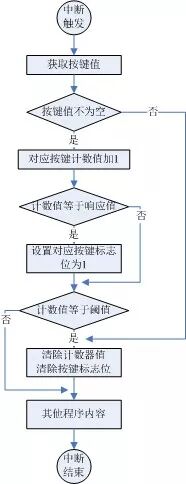 那么我就需要一个变量来计数!每次定时器中断时,我们就需要检测下,某个按键是否按下,如果按下,那么我们就把他对应的计数变量加1,如果这个变量等于8(8 = 40ms/5ms)时,我们就给按键的标志位置为1,如果没有按键检测到那个按键没有按下,那么我们就把他对应的按键标志位清零,且他对应的计数变量清零。下面是他的流程图!